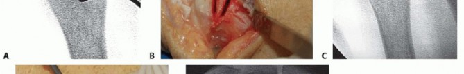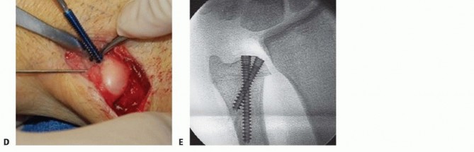 TECH FIG 7 • A. Fluoroscopic image of distal osteotomy, proximal to the sigmoid notch. B. Completion of radial wedge osteotomy. Bone wedge is removed using an osteotome. C. Fluoroscopic image of completed radial wedge osteotomy. D. Placement of headless compression screw over Kirschner wire. E. Radiograph after screw placement showing osteotomy compression. (From Slade JF III, Gillon TJ. Osteochondral shortening osteotomy for the treatment of ulnar impaction syndrome: a new technique. Tech Hand Up Extrem Surg 2007;11:74-82.)Based on preoperative determinations, resect a 3- to 5-mm wafer of bone using a microsagittal saw at the level of the proximal margin of the DRUJ.Leave the distal ulnar articular surface and the TFCC foveal attachments intact (TECH FIG 7A-C).Reduce and compress the osteotomy with a hemostat and a Kirschner wire placed for temporary stabilization.Intraoperative fluoroscopy is used to confirm the adequacy of resection and osteotomy reduction. More bone can be removed if necessary, up to 5 mm total.Excessive bony resection could lead to DRUJ instability or impingement.Thread a cannulated headless compression screw over the previously inserted Kirschner wire while manual compression is maintained (TECH FIG 7D,E).Remove the Kirschner wire and irrigate the wounds.Repair the dorsal capsule with interrupted nonabsorbable sutures.Transpose the extensor digiti quinti tendon out of the fifth compartment as the capsule is repaired.Close the skin incision with a nonabsorbable monofilament suture, and inject all incisions, as well as the wrist, with a local anesthetic.Place the wrist in a bulky dressing with a volar splint.P.1054
