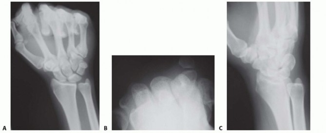 TECH FIG 5 • A. Posteroanterior (PA) wrist radiograph showing ulnar positive variance. B,C. PA and lateral radiographs after ulnar shortening osteotomy. The interfragmentary lag screw compresses the osteotomy site.