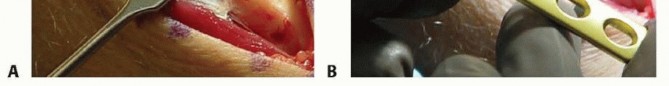 TECH FIG 1 • A. An 8- to 10-cm incision over the subcutaneous border of the ulna. B. Six-hole AO-type dynamic compression plate (DCP) (Synthes). Avoid interfering with the osteotomy when placing the pins by referring to the line drawn at the proposed osteotomy site.Place the pins palmar enough to allow the plate to be securely seated over the dorsal surface of the ulna.