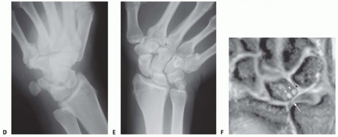 Plain radiographic views should include neutral rotation posteroanterior and lateral projections of both wrists. These are obtained with the patient seated and the elbow flexed at 90 degrees and the shoulder abducted at 90 degrees.The contralateral wrist films may be used as a template for reconstruction.Radiographic assessment of ulnar variance has used a neutral rotation radiographic view of the wrist that provides an image of the radioulnar length with the wrist unloaded. Such views may underestimate variancein wrists in which power grip and pronation result in significant proximal migration of the radius. Tomaino25 found that ulnar variance increased an average of 2.5 mm using the pronated grip view and ranged from an increase of 1 to 4 mm (FIG 3A).Other plain views may be obtained based on clinical suspicion.The carpal tunnel (FIG 3B) view visualizes the hook of the hamate and the pisotriquetral joint. An oblique view in 30 degrees of pronation (FIG 3C) allows evaluation of the dorsoulnar wrist.The reverse oblique view (30 degrees of supination) (FIG 3D) allows evaluation of the palmar ulnar wrist with a profile of the pisotriquetral joint.An ulnar deviation posteroanterior view (FIG 3E) may reveal lunotriquetral instability or evidence of ulnocarpal abutment. If ulnocarpal abutment is suspected, it is often useful to obtain a posteroanterior radiograph with the forearm in pronation and the fist clenched (see FIG 3A), which increases ulnar variance.Videofluoroscopy is useful for evaluating dynamic ligament instabilities. The wrist should be examined through an entire active and passive ROM as well as with provocative maneuvers in an attempt to demonstrate pathology while reproducing symptoms.Arthrography may demonstrate a TFCC defect or interosseous ligament disruption if contrast material injected into one compartment leaks into an adjacent space.Magnetic resonance imaging (MRI) can aid in the detection of soft tissue and osseous lesions, including interosseous and extrinsic ligament tears, TFCC defects, tumors, avascular necrosis, and occult fractures (FIG 3F).Sensitivity of the MRI increases if it is combined with arthrography. The ability to show marrow changes in the ulnar portion of the lunate and simultaneous central TFCC pathology is very helpful in confirming a diagnosis of ulnocarpal impaction.Arthroscopy can confirm a diagnosis suggested by findings from other diagnostic modalities.This is the most sensitive tool for diagnosis of chondral and ligamentous pathology.It has therapeutic applications in the management of ulnar abutment, TFCC defects, interosseous ligament tears, chondral defects, loose bodies, synovitis, and degenerative arthritis.Bone scan, ultrasonography, and computed tomography serve a very limited role in the diagnosis of ulnar impaction syndrome.