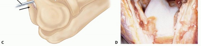 TECH FIG 3 • A,B. Once the foraminectomy is completed, the core of bone is removed from the distal humerus. This allows access to the anterior elbow compartment and to the coronoid. At this time, loose bodies of the anterior compartment may be identified and removed. C. With maximum elbow flexion, the anterior osteophyte from the coronoid process is removed, using a curved osteotome. D. An instrument is then introduced through the foramen, and the osteophyte and a portion of the coronoid are removed. Occasionally, it is necessary to strip the anterior capsule from the anterior humerus using a blunt periosteal elevator to restore extension.Care must be taken to ensure that no osteophytes or loose bodies are overlooked.Bone wax is used to cover the margins of the foramen, and Gelfoam is inserted into the defect to fill the dead space.The wound is meticulously irrigated and closed in standard fashion. The elbow is carefully manipulated to maximize the total arc of motion.P.9153. Arthroscopic Ulnohumeral ArthroplastyThe elbow joint is insufflated with 15 to 20 mL of normal saline to distend the capsule of the joint.An anterolateral portal is established proximally to radiocapitellar joint and anteriorly to the lateral supracondylar ridge of the distal humerus.The arthroscope is introduced through the anterolateral portal allowing visualization of any pathologic structures of the anterior compartment of the joint and then an anteromedial portal is established.Removal of loose bodies and débridement of the anterior aspect of the elbow can be performed using an arthroscopic grasper and an arthroscopic shaver.The posterior aspect of the elbow is then palpated, and a standard posterolateral and posterior central portal are established.Débridement of spurs from the olecranon fossa and removal of loose bodies of the posterior aspect of the elbow can be performed through the posterior central portal.A 3.2-mm drill is then inserted through the posterior central portal into the center of the olecranon fossa and is angled toward to the center of the coronoid fossa. A drill hole is then developed from posterior to anterior to fenestrate the olecranon fossa.Under arthroscopic visualization through the anterolateral portal, the drill hole is enlarged in diameter to at least 1 cm using progressively larger drill bits.Once the foraminectomy of the olecranon fossa is complete, removal of the osteophyte from the coronoid process can be performed with maximum elbow flexion using an arthroscopic burr.All incisions are closed in standard fashion.