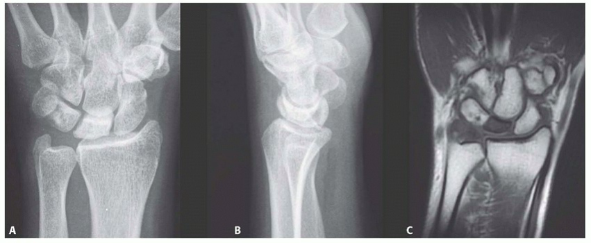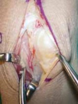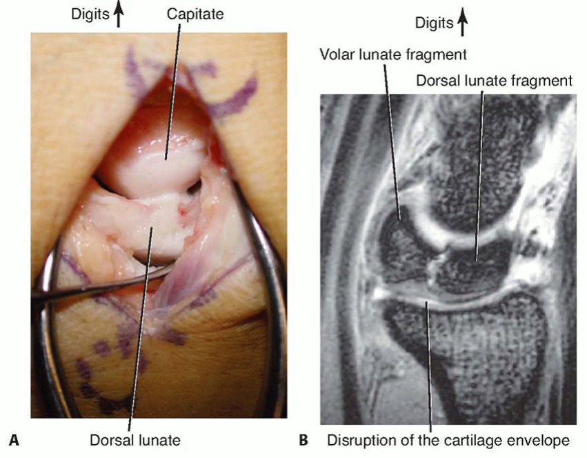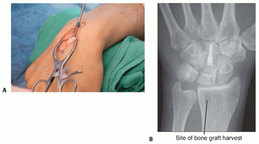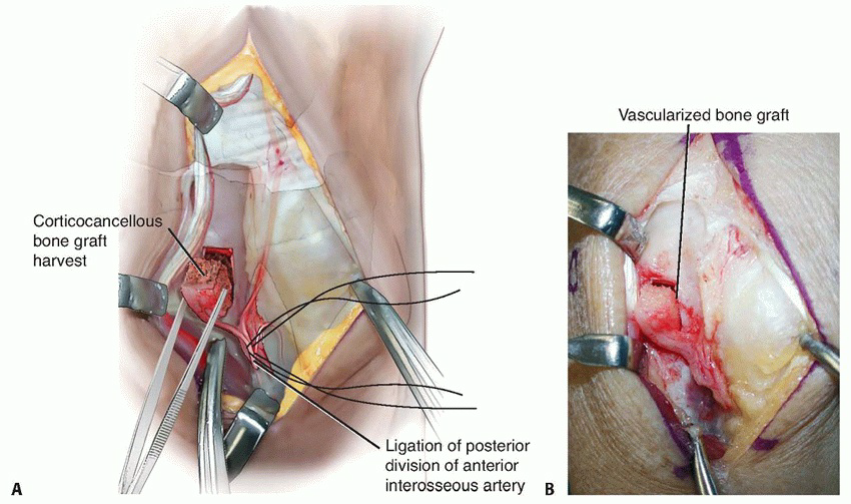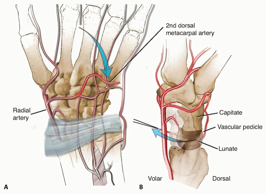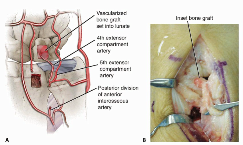 Incision and Approach1. Make an extensive dorsoradial incision extending from the second metacarpophalangeal joint to a point about 4 cm proximal to the wrist, which gently slopes ulnarly around the tubercle of Lister.1. Visualize and protect the dorsal sensory branch of the radial nerve.2. Incise the extensor retinaculum over the third compartment and transpose the extensor pollicis longus into a subcutaneous position.3. Retract the contents of the fourth extensor compartment ulnarly and the second extensor compartment radially.4. Use fluoroscopy to confirm the lunate’s location.5. Perform a standard ligament-splitting capsulotomy.1. Take care to avoid injury to the transverse basal dorsal metacarpal arch from which the vascular pedicle arises.6. Inspect the lunate and surrounding joints. Perform a syn-ovectomy as required.Elevation of the Second Dorsal Metacarpal Vascular Pedicle7. In the interval between the second and third metacarpals, incise the interosseous muscle fascia from proximal to distal.1. The vessels lie underneath the aponeurosis that covers the interosseous muscles.8. Elevate the artery and venae comitantes along with a thin layer of surrounding perivascular areolar tissue fromthe second dorsal web space to the dorsal carpal arch (TECH FIG 4A).9. Identify and coagulate all branches off this main metacarpal artery.21. Ligate the vessel at its most distal location.1. This should provide a 5- to 6-cm vessel of adequate length to reach the dorsal lunate.Lunate Preparation and Implantation of the Vascular Bundle22. Curette and expand the lunate as discussed earlier.23. Pack autogenous cancellous bone graft into the lunate.24. Use a 2.7-mm bit and drill from dorsal to volar through the body of the lunate.25. Sew a 5-0 monofilament suture to the end of the mobilized vessel, then place the suture ends through the eye of a straight needle.26. Feed the vessel into the avascular portion of the lunate by passing the needle from dorsal to volar through the previously drilled hole, exiting the palmar skin just ulnar to the flexor carpi radialis tendon (TECH FIG 4B).27. Make a small skin incision over the needle and tie the suture over the palmar antebrachial fascia.28. Release the tourniquet to assess vessel patency.29. Achieve hemostasis and close the capsule, retinaculum, and skin in the manner described earlier.30. Apply a nonocclusive dressing and a volar, below-elbow splint.
