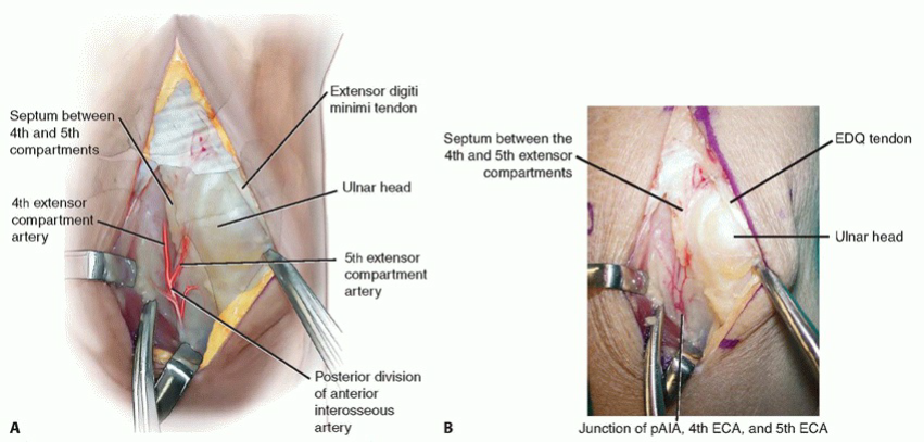 Exposure and Identification of the Fourth and Fifth Extensor Compartment Arteries1. Make a 5- to 6-cm longitudinal skin incision between fourth and fifth extensor compartments, ending distally between the third and fourth metacarpal bases.2. Incise the fifth extensor compartment.3. Identify the fifth ECA and its venae comitantes on the radial aspect of the compartment lying adjacent to or partially within the septum and separating the fourth and fifth extensor compartments (TECH FIG 1).7. Trace the fifth ECA proximally to its origin from the posterior division of the anterior interosseous artery as it emerges from the interosseous membrane.