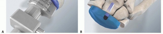 TECH FIG 4 • A. Insert the radius trial component into the prepared radius. B. Insert the carpal component and apply the trial poly bearing.