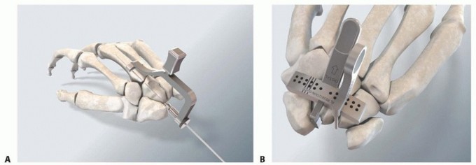 TECH FIG 2 • A. The lunate is excised to expose the capitate. The modular drill guide is applied with the barrel pressed against the center of the capitate head and the saddle on the third metacarpal. A guidewire is inserted through the center of the capitate into the third metacarpal. B. Insert the carpal guide bar into the capitate and mount the resection guide with the hamate feeler just touching the proximal pole of the hamate.(continued)