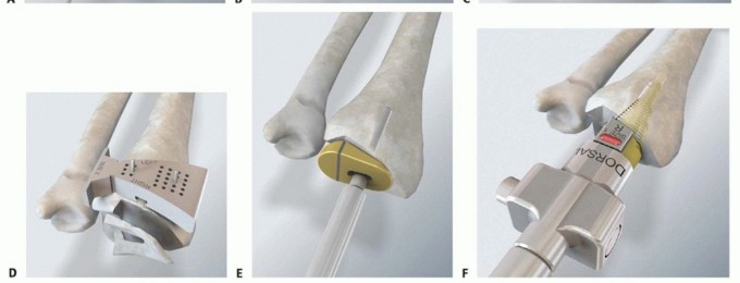 TECH FIG 3 • A. Using the modular drill guide, a guidewire is inserted through the articular surface of the radius and down the center of the radius canal (confirm correct position with fluoroscopy). Drill the hole for the guide rod using the cannulated drill bit. B. Apply the radius resection guide in a position that will resect only the articular surface of the distal radius (a laser mark on the guide arm corresponds to the level where the barrel is pressed against the articular surface). C. Use the radius score guide to make an initial vertical cut, which will mark the ulnar extent of the horizontal cut to protect the DRUJ. D. Complete the distal radius articular surface resection. E. After reinserting the guide rod, use the radius drill guide followed by the box punch to remove the remaining hard subchondral bone of the distal radius. F. Perform sequential broaching to the appropriate size.