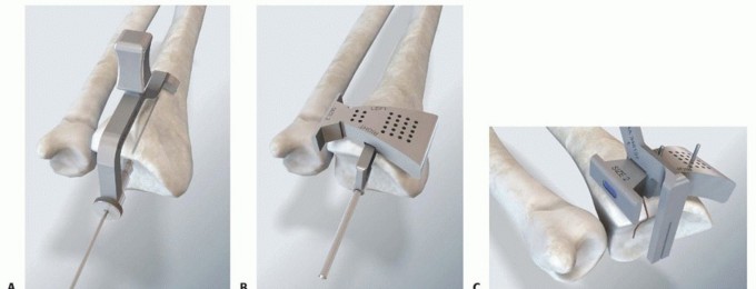 TECH FIG 5 • A. Impact the carpal component and insert the fixation screws, beginning with the radial screw using the modular drill guide, guidewire, and cannulated drill for preparation. B. Apply the locking caps over radial and ulnar carpal screws. C. Impact the radial component, apply the appropriate poly bearing, reduce the joint, and assess range of motion and joint stability. Drill to the proper depth with a cannulated drill bit and insert a 4.5-mm screw of the measured depth.Using a similar technique for the ulnar screw, position the modular drill guide barrel in the ulnar hole of the carpal component and its saddle on the fourth metacarpal shaft. Insert a guidewire, measure, anddrill. Insert a screw of proper length. Do not penetrate the fourth CMC joint (TECH FIG 5A). Apply locking caps over the two carpal screw heads (TECH FIG 5B).Confirm appropriate carpal poly thickness using carpal poly trials.Apply the carpal poly implant and impact it into place, ensuring there is no impinging soft tissue. Reduce the joint and make a final assessment of the balance and stability (TECH FIG 5C).7. Bone Graft and ClosureP.1005Perform an intercarpal fusion by carefully resecting portions of the joint surfaces and then inserting cancellous bone chips from the previously resected bone into the prepared fusion sites.Reattach the dorsal capsule to the dorsal rim of the radius using the previously placed sutures. The medial and lateral edges of the capsule are also closed.If the capsule is insufficient for closure with the wrist flexed 30 degrees, it is supplemented with a portion of the extensor retinaculum.A suction drain is placed, skin is closed, and a bulky dressing with a below-elbow plaster splint is applied.Indications1. Wrist degeneration resulting from all causes of arthritis serves as an indicationfor this surgery; however, patients should be of appropriate age and have fewer activity demands.2. Severe loss of bone stock and active and aggressive inflammatory arthritis are contraindications.Surgicaltechnique1. Adequate exposure is mandatory to achieve accurate component implantation.2. Intercarpal arthrodesis is a key factor in obtaining long-term fixation of the implants.DRUJ ▪ Preservation of the DRUJ including the TFCC improves stability of the wrist andmanagement overall functional outcome.1. When treatment is needed, expose the DRUJ through the same skin incision but through a separate capsulotomy.